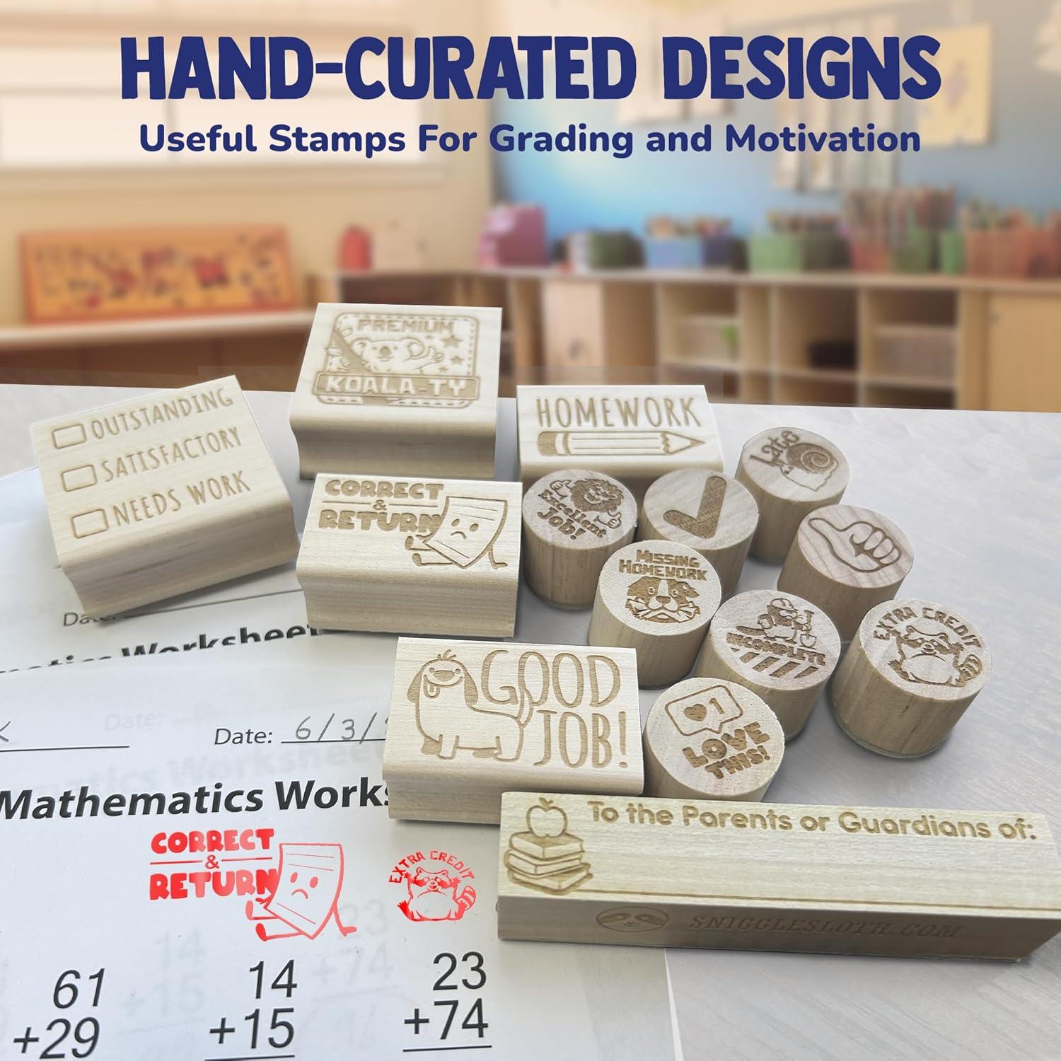 - Classrooms are tough. Your tools should be tougher. Durable, grab-and-go wooden teacher stamps. From Monday mornings to Friday folders, these school stamps for teachers are built to last. Each one features a solid wood handle, deep rubber engraving, and the design is engraved on top so you can always grab the right stamp fast. Whether you're marking behavior stamps for teachers, homework stamps, or sign and return stamp teacher notes — these stamps don't break!