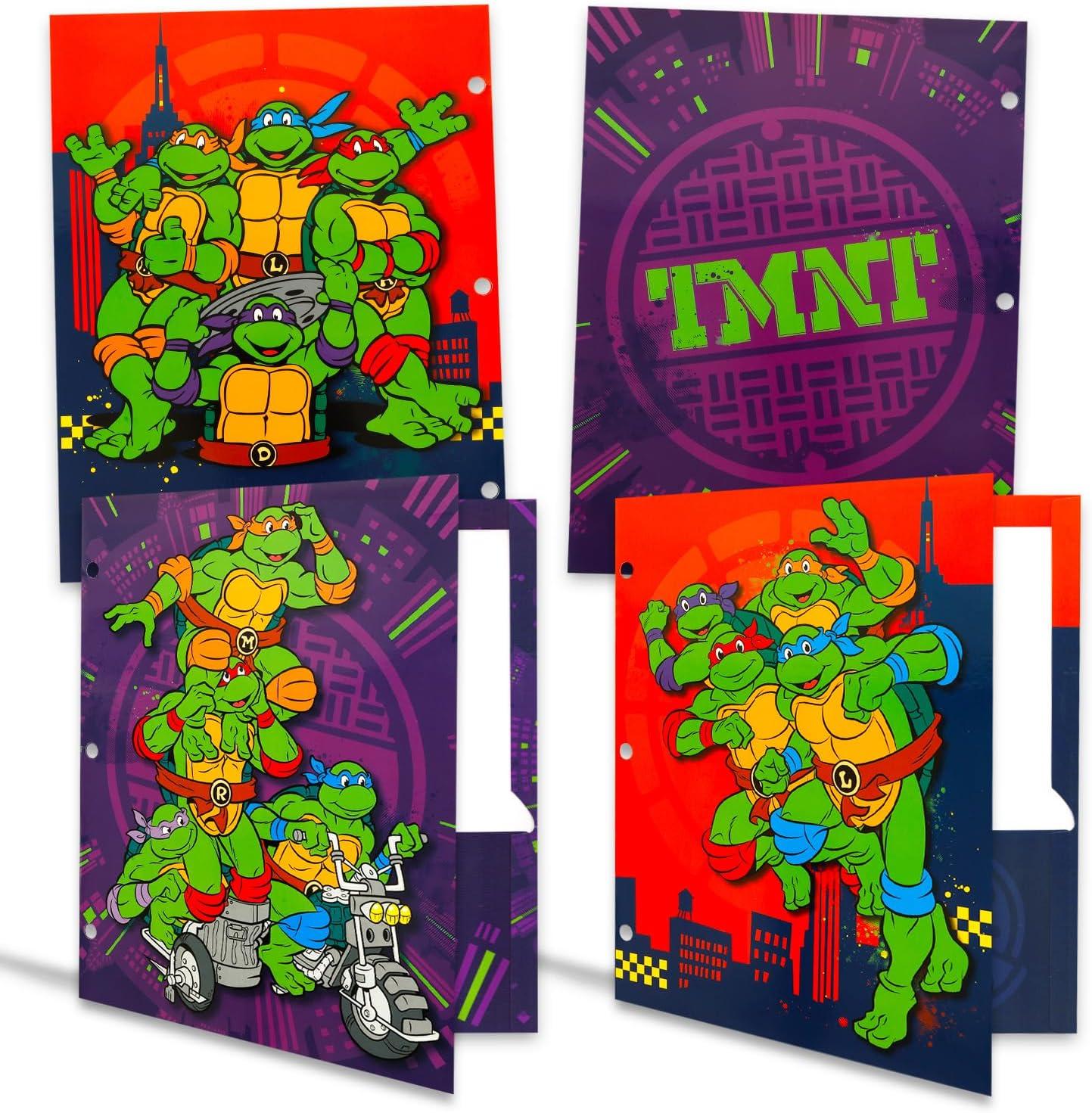 Teenage Mutant Ninja Turtles Folder Set - Bundle with 4 Laminated Folders with 2 Pockets Each for Office, Classroom, Plus More | TMNT Back to School Supplies. This Teenage Mutant Ninja Turtles back-to-school set includes four two-pocket folders, each featuring vibrant artwork of Leonardo, Donatello, Raphael, and Michelangelo. These folders help keep important papers organized and are ideal for use as classroom supplies. Each folder is me of laminated material, ensuring it lasts throughout the en