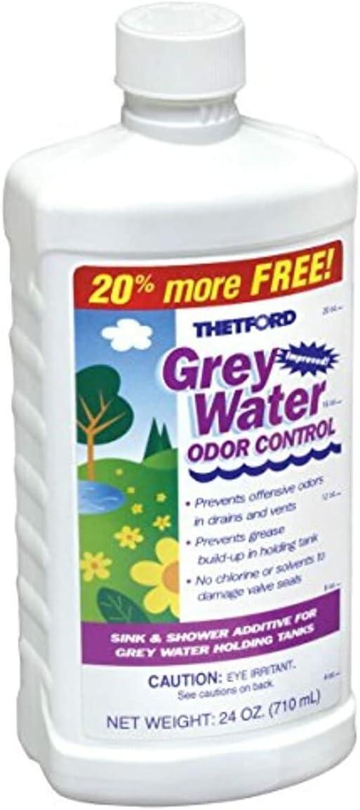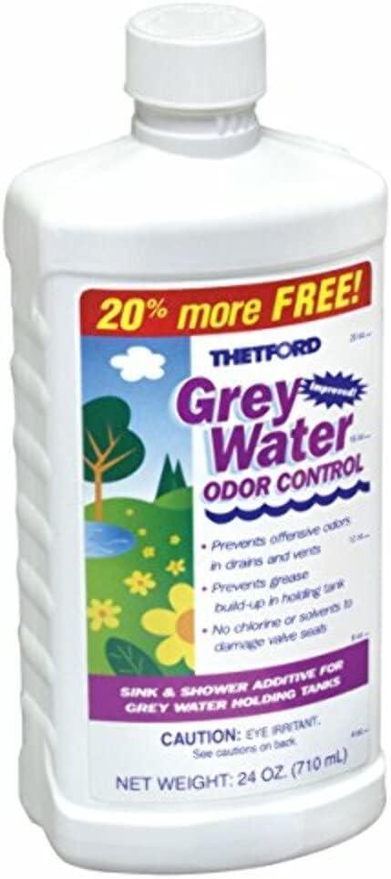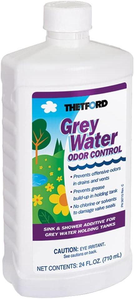 Thetford's Grey Water Odor Control is the perfect solution for eliminating grey water odors. Not only that, the product is designed to also eliminate and prevent odors in showers, drains, vents, and traps of sinks. Formulated as a 100% biodegrable, chlorine- and solvent-free holding tank deodorant, Grey Water Odor Control dissolves cooking grease and cleaning residues and prevents build-up in grey water holding tanks.