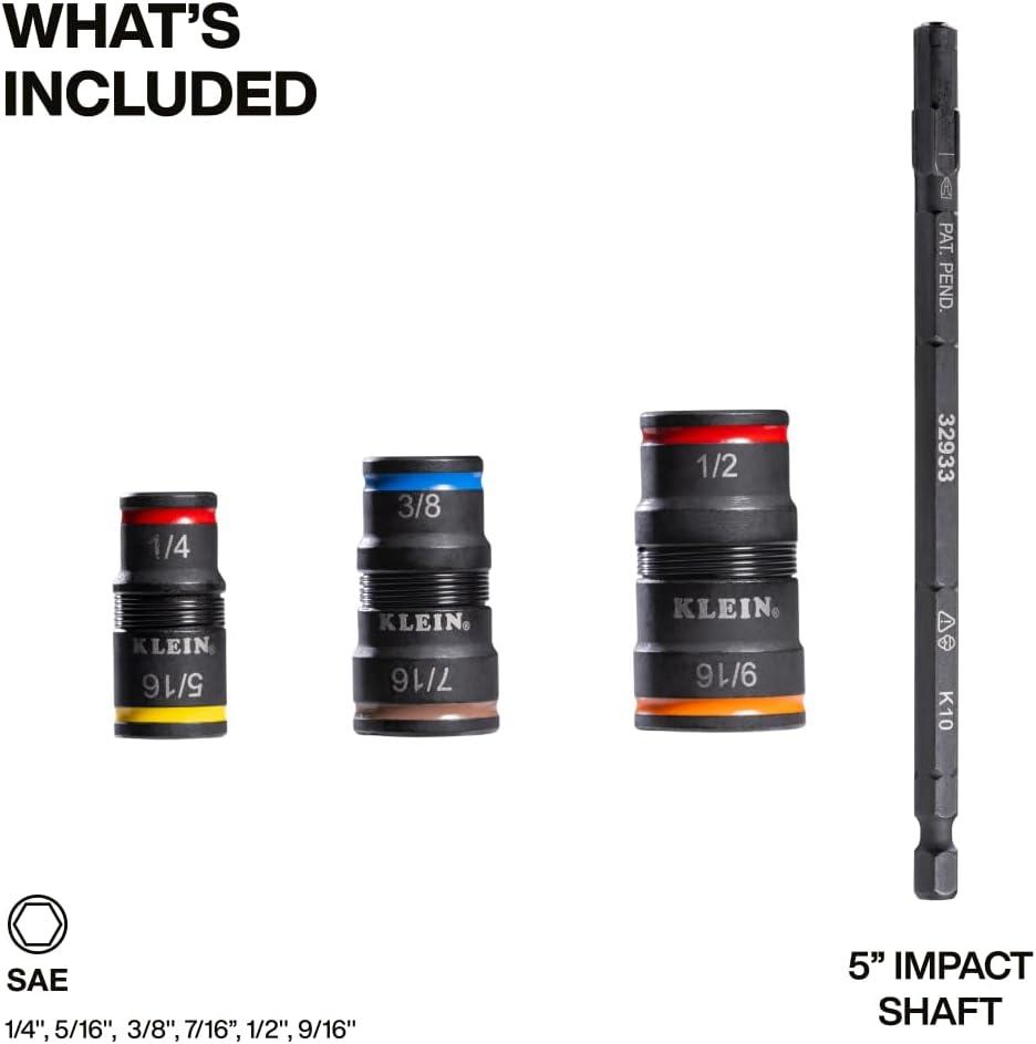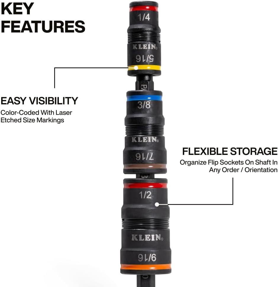 The 7-in-1 Impact Flip Socket Set provides 6 nut driver sizes plus a bit holding feature all within one compact tool. The versatility provided allows for convenient swapping between the common nut driving sizes and quickly attaches to an impact driver or our 1/4-Inch quick-connect handles (handles not included). Every component is impact-rated, making it an essential tool for the toughest driving applications. For more than 160 years, Klein Tools has manufactured premium-quality, professional-gr