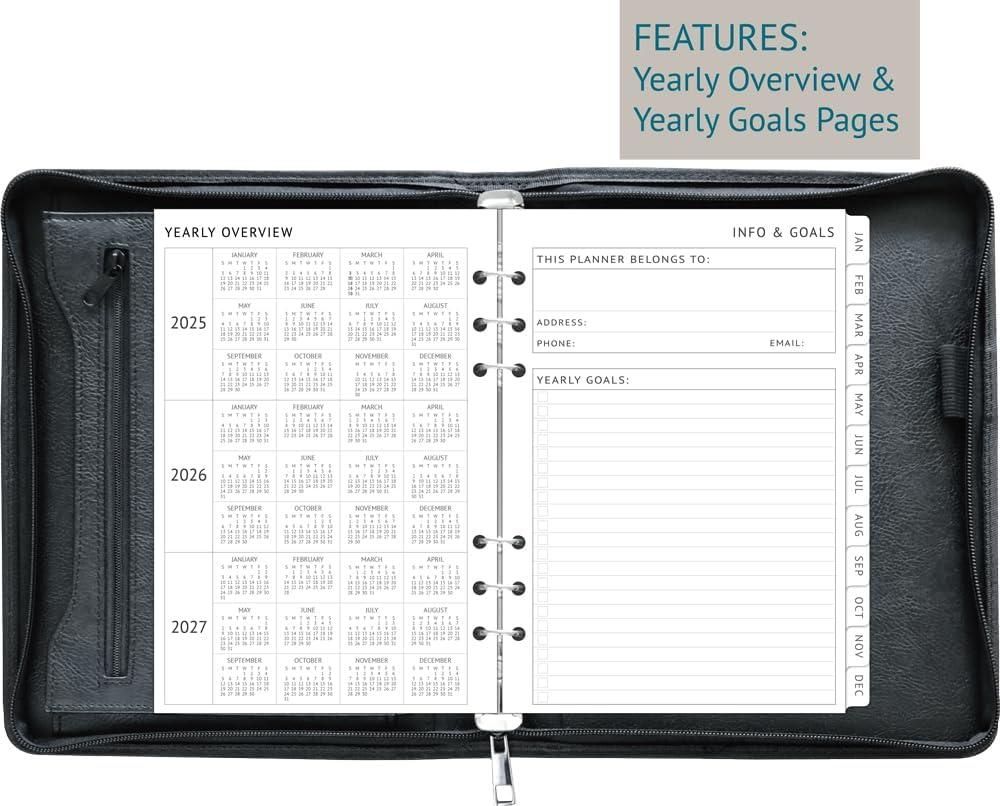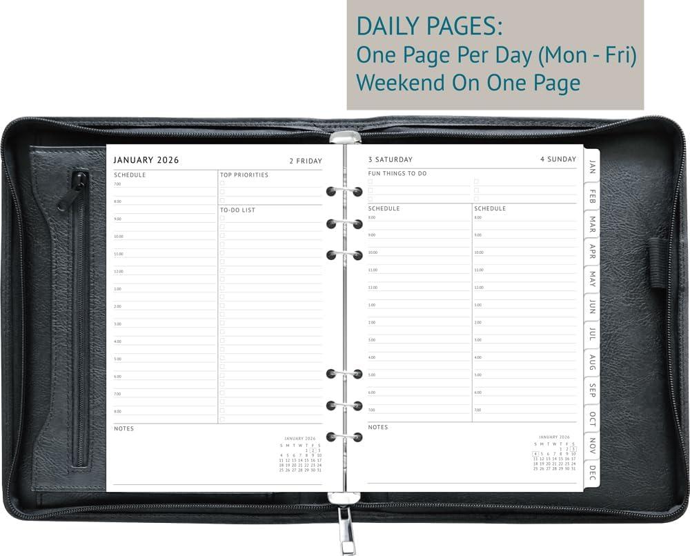 Track appointments, make to-do lists, set goals, and life a more organized lifestyle with a weekly and monthly planner that helps you manage it all. A5 Zipper Binder Details: vegan leather cover durable 6-ring binder, 1” rings large open & zippered pockets ID pocket 5 card sleeves elastic pen holder zipper closure fit standard 6-hole punched A5 pages 2026 Daily Planner Refills: runs from Jan 2026 to Dec 2026 monthly spre pages with coated tabs one page per day (weeked on one page) calendar and h