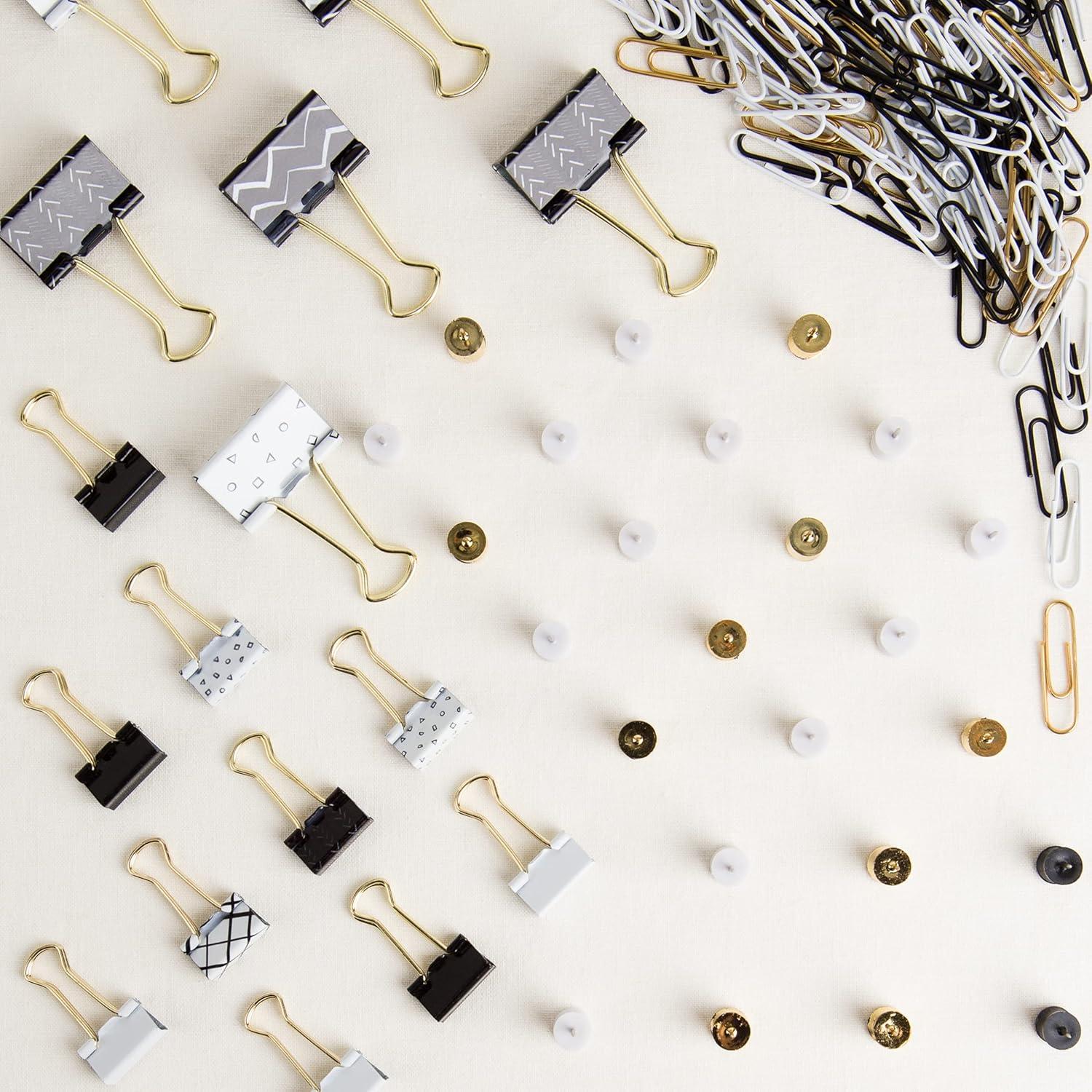 Need to boost your creativity and organization level? U Brands has the tools to get you there. Ideal for use at home, in the classroom or in the office, our 173-count set of office accessories allows you to keep your work environment sorted and d a bright, personalized touch. Featuring black, white and gold-tone surfaces, 120 paper clips, 18 small binder clips, and 35 push pins provide a hint of vibrancy among any decor you may have. Mark note pages and more for easy viewing with these quality p